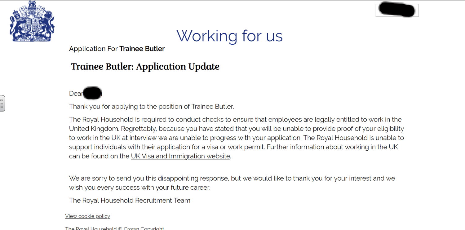 Today I had some free time during work today so I decided to browse the internet. On a news website, I will not say which one due to copyright purposes, there was an advertisement for a chef position in Buckingham Palace. Unfortunately I did not meet the qualifications. So I looked at other available positions and found a trainee butler position open. After reviewing the qualifications it appeared I had met them all. I filled out an application pronto, however, due to not having a UK work permit and visa I was not offered the position. So now I am in the process of filing for a visa and work permit. I will keep you, the readers, informed on the process! Below is my application update.