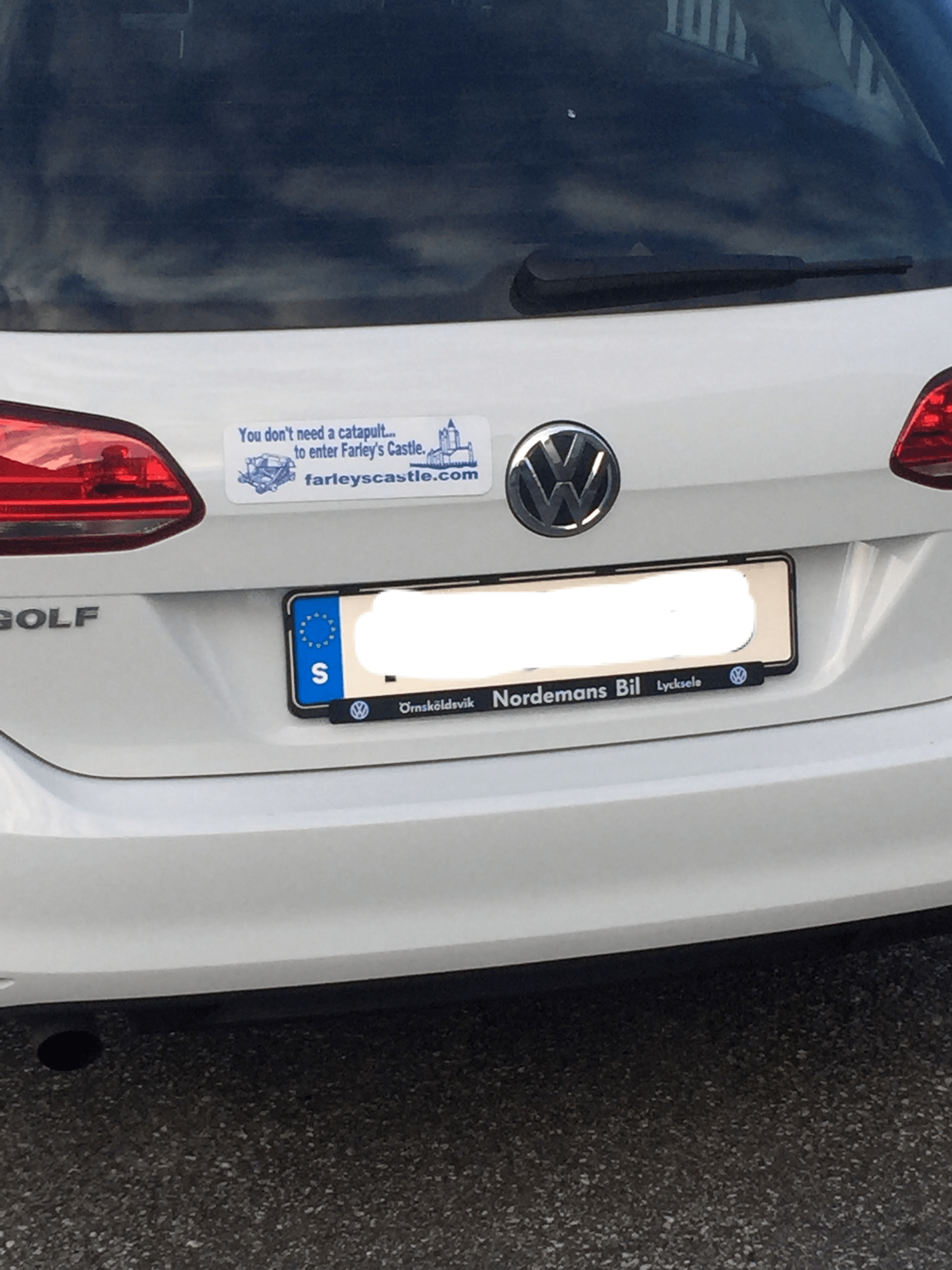I wanted everyone to know that Farley’s Castle has reached Europe! Thanks to one of our biggest fans, Austin, the blog has now been spread into Sweden via bumper sticker! Austin personally put his genuine, magnetic Farley’s Castle bumper stick on the back of his Volkswagen. Remember folks you can purchase you very own bumper sticker through me at farleyscastle@yahoo.com. Thank you Austin for the representation and good luck with your hockey career over in Sweden!!