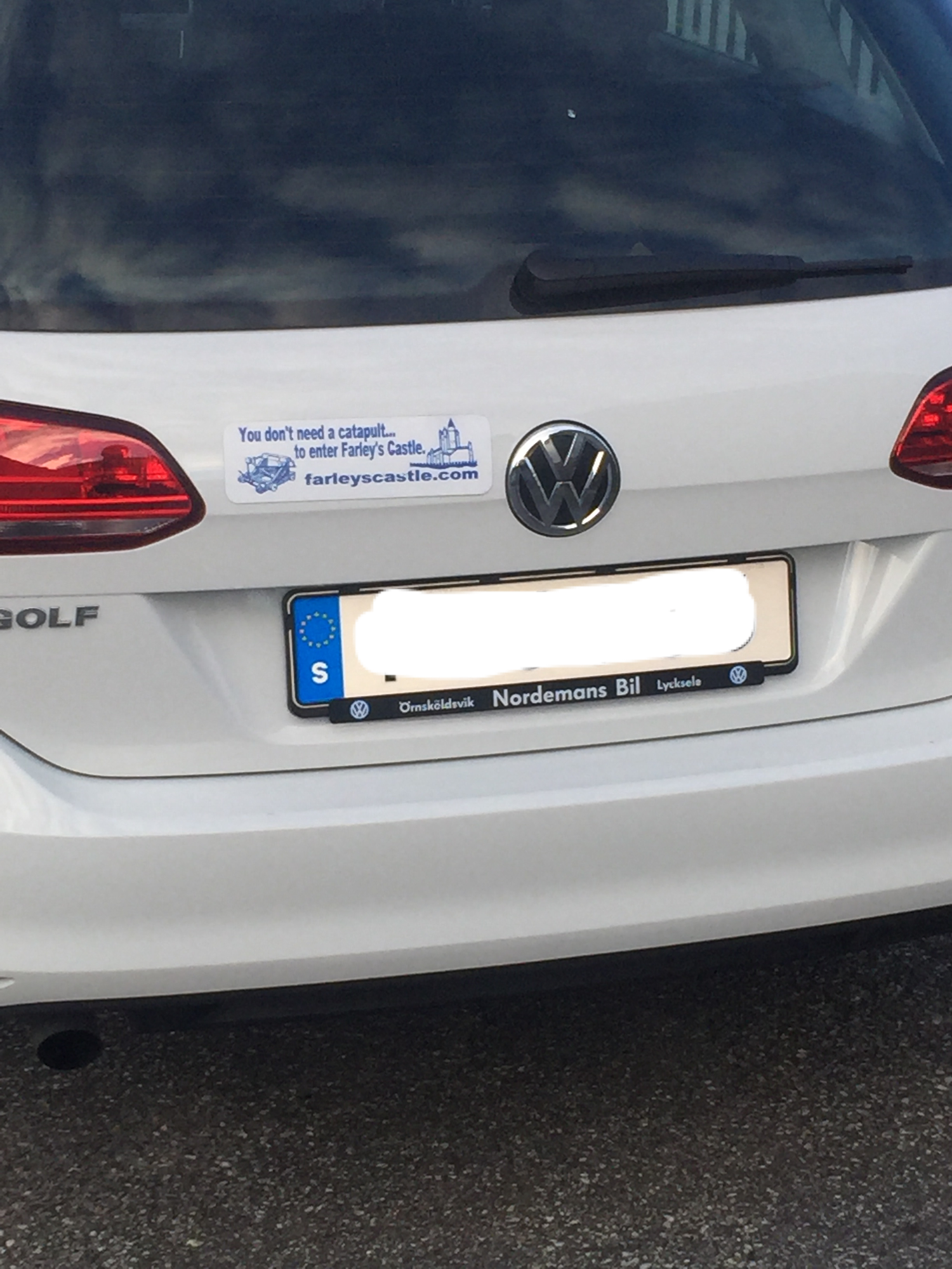 I wanted everyone to know that Farley’s Castle has reached Europe! Thanks to one of our biggest fans, Austin, the blog has now been spread into Sweden via bumper sticker! Austin personally put his genuine, magnetic Farley’s Castle bumper stick on the back of his Volkswagen. Remember folks you can purchase you very own bumper sticker through me at farleyscastle@yahoo.com. Thank you Austin for the representation and good luck with your hockey career over in Sweden!!