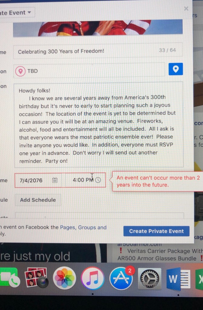 I have always been a supporter of Facebook. In face, I refuse to get a Twitter or Instagram because I believe in sticking to my roots! However, after trying to create an event I realized why people do not use “the book” anymore. Please review the picture below and look closely to the policy in red.